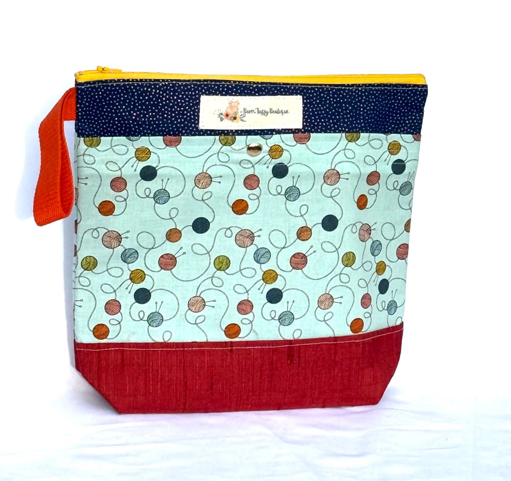 This bag is handmade by me. I can fit up to 8, 100 gram skeins in this project bag.